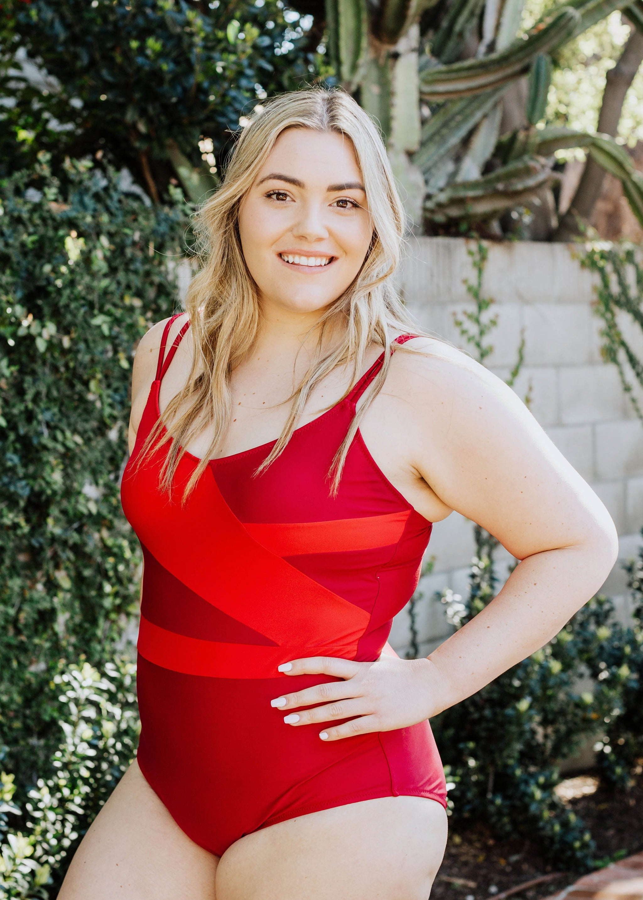Katharine makes a splash by intertwining bold diagonal lines and bright color blocking to artfully highlight the waist and curves.
